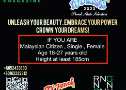 True Beauty shines from inside out, embodied by a woman’s poise, elegance and confidence. We are looking for Winners for 3 prestigious Miss Malaysia Tourism Titles, who will promote Malaysia’s sights and sounds, to the World.